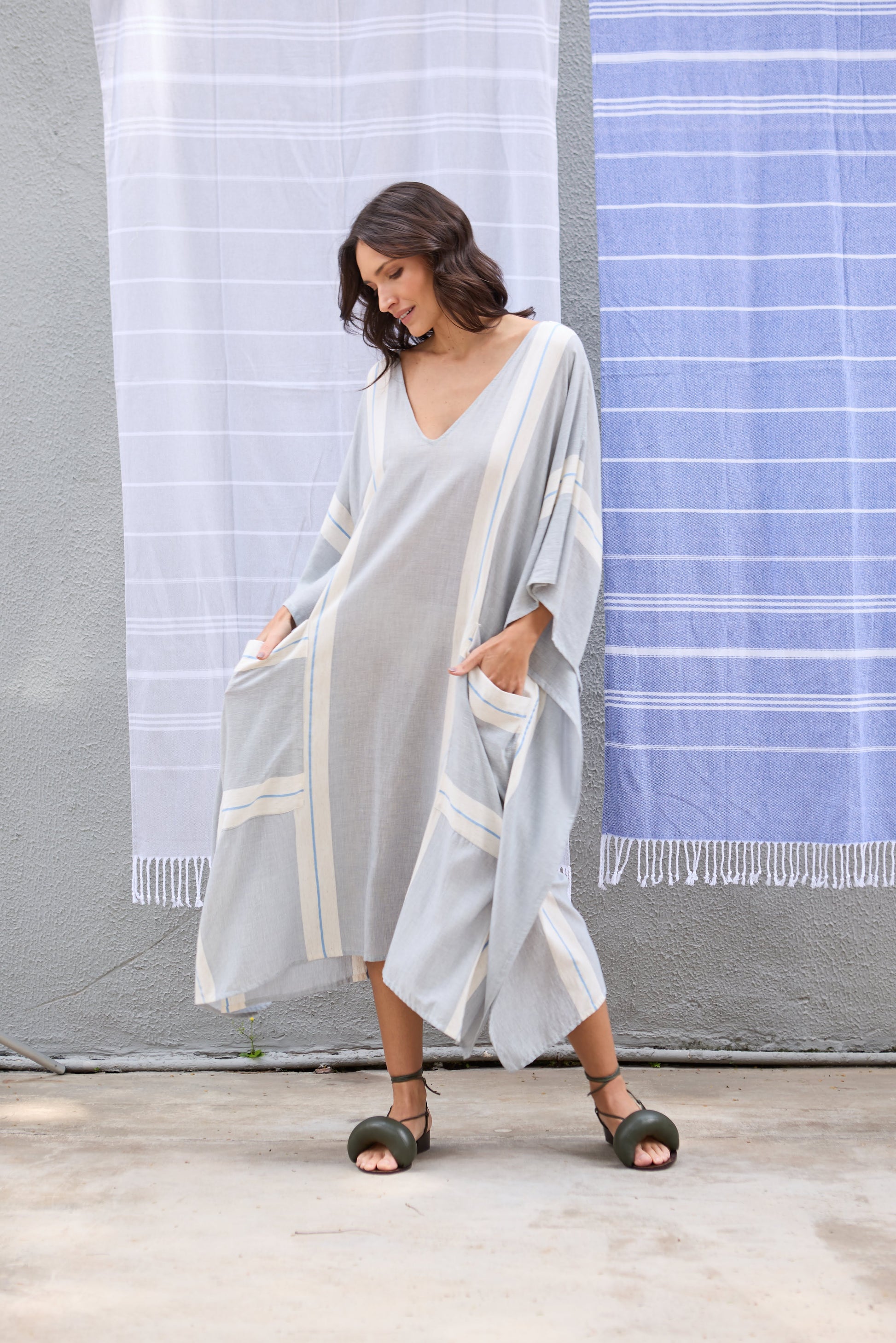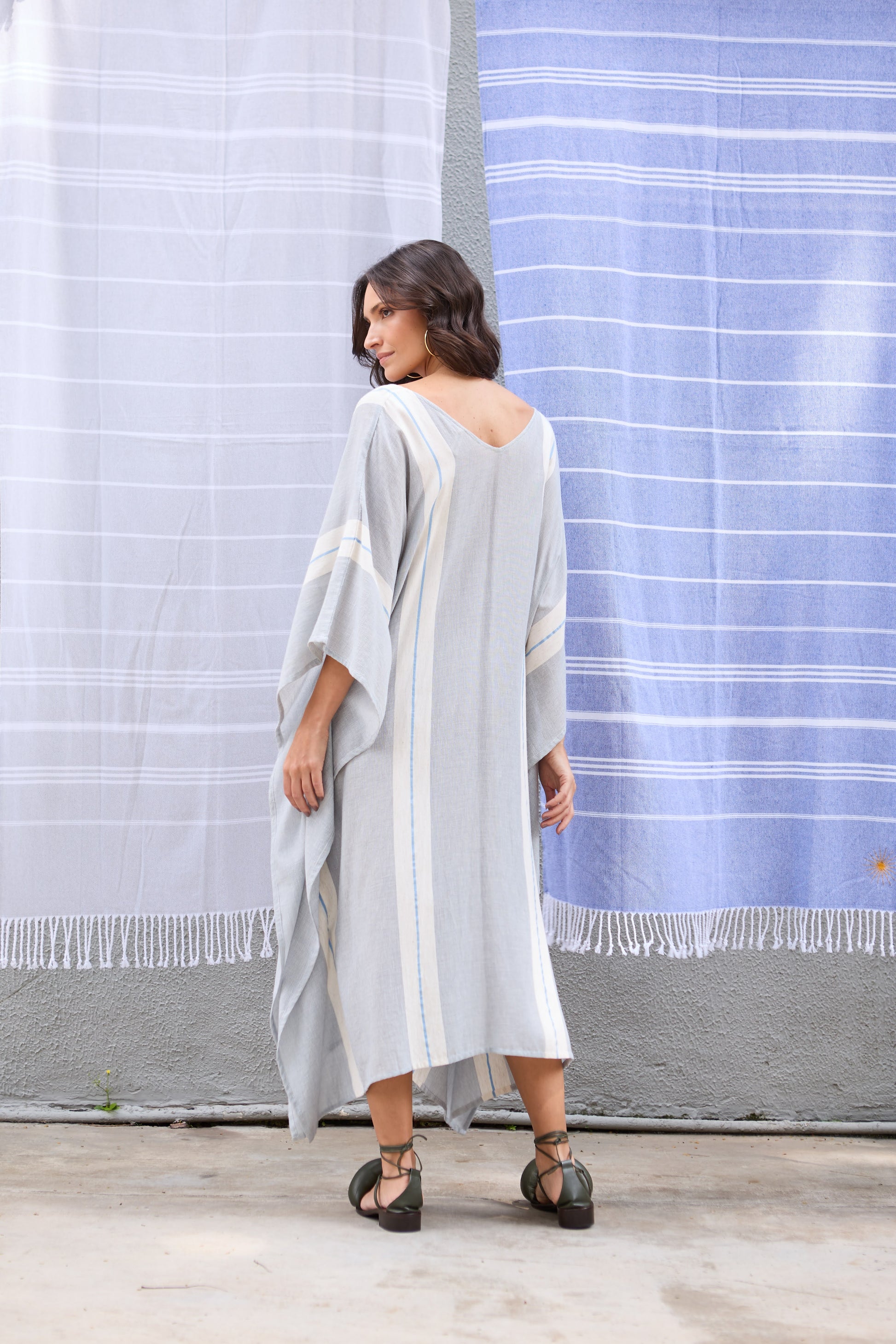 Combinando o estilo high & low com o conforto do style & comfy, o Caftan Bol se destaca pelas listras em tons de azul e pelo acabamento rústico e artesanal. Os maxi-bolsos frontais brincam com a direção das listras, adicionando leveza e um toque de irreverência ao visual.